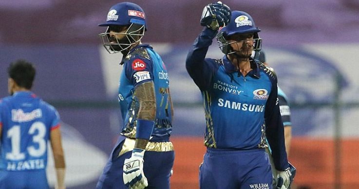 क्विंटन डी कॉक ने रोहित शर्मा के आउट होने पर मोर्चा संभाला और दिल्ली के गेंदबाजों की धुनाई की। उनका साथ सूर्यकुमार यादव ने दिया।दोनों ने अर्धशतक जड़े और दूसरे विकेट के लिए 46 रन की साझेदारी भी की। डी कॉक ने 36 गेंद पर 53 रन बनाए और सूर्यकुमार यादव ने 32 गेंद पर 53 रन बनाए। इन दोनों की पारियों के कारण मुंबई इंडियंस के लिए लक्ष्य आसान हो गया।