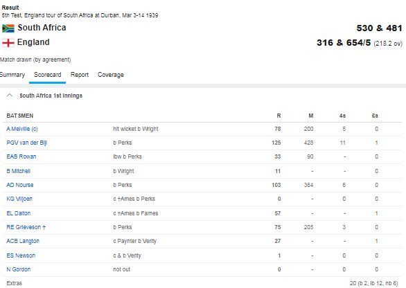 आजकल टेस्ट क्रिकेट को चार दिन का करने के बारे में चर्चाएँ होती है लेकिन पहले यह एक निर्णय आने तक चलते थे। ऐसा ही एक टेस्ट मैच दस दिन तक खेला गया था। 1939 में दक्षिण अफ्रीका और इंग्लैंड के बीच मैच दस दिन तक चला था। 696 रन के लक्ष्य का पीछा करते हुए इंग्लैंड ने पांच विकेट पर 654 रन बनाए थे लेकिन जहाज (शिप) के कैप्टन को इंग्लिश टीम को वापस ले जाना था और उसने इंतजार करने से मना कर दिया इसलिए मैच को दसवें दिन ड्रॉ माना गया।
