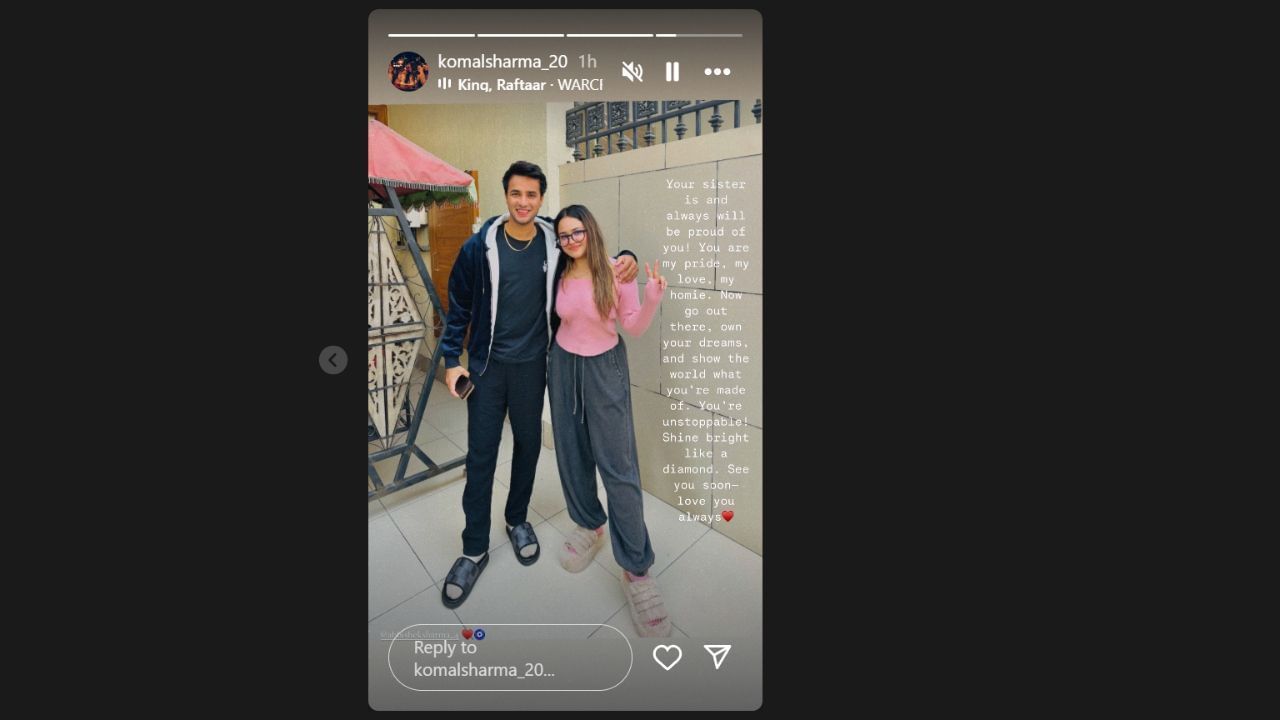 कोमल शर्मा ने रविवार दोपहर अपनी इंस्टाग्राम प्रोफाइल पर चार स्टोरी शेयर की हैं। कोमल शर्मा की सभी स्टोरी से यह साफ जाहिर होता है कि वह अपने भाई से कितना प्यार करती हैं। कोमल की सभी इंस्टाग्राम स्टोरी में अभिषेक नजर आ रहे हैं। आखिरी स्टोरी में, आप देख सकते हैं कि कोमल शर्मा ने अभिषेक शर्मा के साथ अपनी तस्वीर शेयर की है, और उस पर इमोशनल नोट में अपने विचार व्यक्त करते हुए लिखा, "आपकी बहन को आप पर गर्व है और हमेशा रहेगा! आप मेरा गौरव हैं, मेरा प्यार हैं, मेरे हमदर्द हैं। अब बाहर निकलो, अपने सपनों को अपनाओ और दुनिया को दिखाओ कि तुम किस चीज से बने हो। तुम अजेय हो! हीरे की तरह चमको। जल्द ही मिलते हैं, खूब सारा प्यार तुमको।"