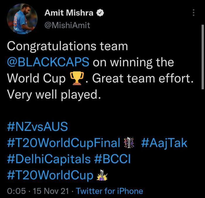 अमित मिश्रा ने अपने ट्वीट में लिखा "वर्ल्ड कप जीतने के लिए न्यूजीलैंड को बधाई। बढ़िया टीम योगदान, आपने काफी शानदार तरीके से खेला।" हालांकि बाद में अमित मिश्रा ने अपना ये ट्वीट डिलीट कर दिया और फिर गलती सुधार कर दोबारा ट्वीट किया और ऑस्ट्रेलिया को बधाई दी।
