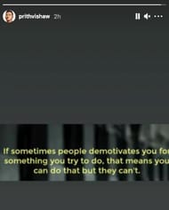 पृथ्वी शॉ की स्टोरी में लिखा गया है कि जब आप किसी चीज को करना चाहते हैं और उसके लिए आपको कोई हतोत्साहित करने का प्रयास करता है इसका मतलब यह है कि आप तो उस काम को कर सकते हैं लेकिन वे लोग नहीं कर सकते।