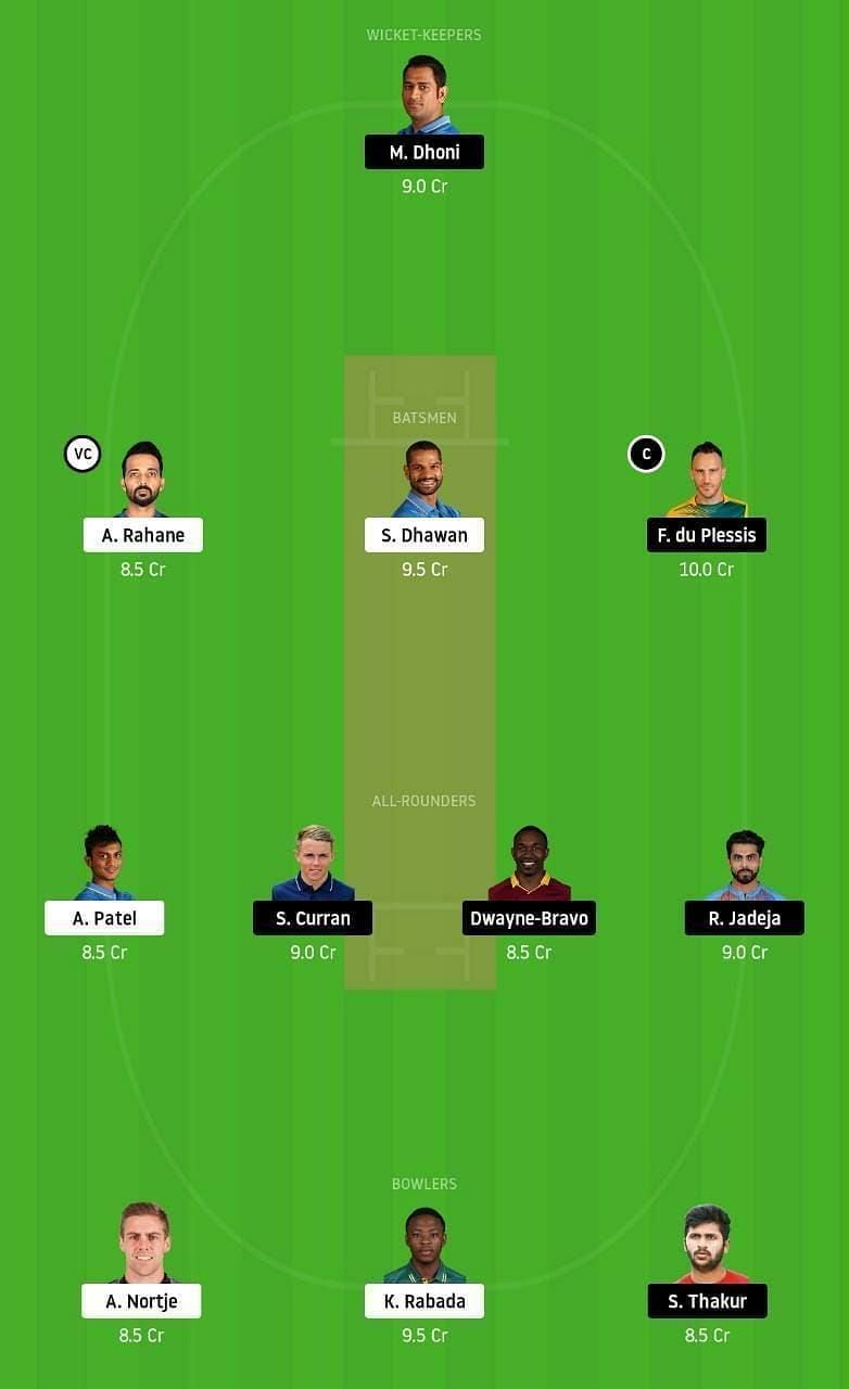Fantasy Suggestion #1: महेंद्र सिंह धोनी, अजिंक्य रहाणे, शिखर धवन, फाफ डू प्लेसी, अक्षर पटेल, सैम करन, ड्वेन ब्रावो, रविन्द्र जडेजा, कगिसो रबाडा, एनरिक नॉर्टजे, शार्दुल ठाकुर।