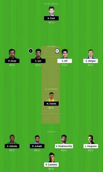 Fantasy Suggestion #1: ऋषभ पन्त, श्रेयस अय्यर, शुभमन गिल, ओइन मॉर्गन, पृथ्वी शॉ, मार्कस स्टोइनिस, कगिसो रबाडा, पैट कमिंस, रवि अश्विन वरुण चक्रवर्ती, लोकी फर्ग्युसन।