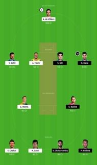 Fantasy Suggestion #1: एबी डीविलियर्स, विराट कोहली, आरोन फिंच, शुभमन गिल, नितीश राणा, क्रिस मॉरिस, सुनील नारेन, युजवेंद्र चहल, नवदीप सैनी, वरुण चक्रवर्ती, प्रसिद्ध कृष्णा।