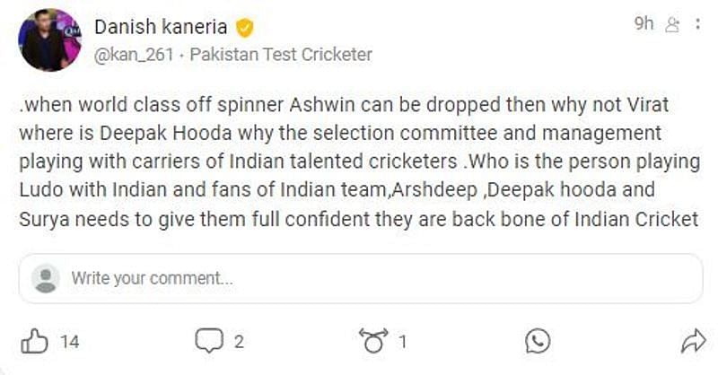 सोशल मीडिया एप 'कू' पर दानिश ने एक पोस्ट लिखते हुए कहा कि जब वर्ल्ड क्लास ऑफ़ स्पिनर अश्विन को बाहर किया जा सकता है तो विराट कोहली को क्यों नहीं? दीपक हूडा कहाँ है, चयन समिति और मैनेजमेंट प्रतिभाशाली भारतीय क्रिकेटरों के करियर से क्यों खेल रहा है? वह कौन है जो भारतीय क्रिकेट और फैन्स के साथ लुडो खेल रहा है? अर्शदीप, हूडा और सूर्या को पूरा आत्मविश्वास देना चाहिए क्योंकि वे भारतीय क्रिकेट की रीढ़ हैं।