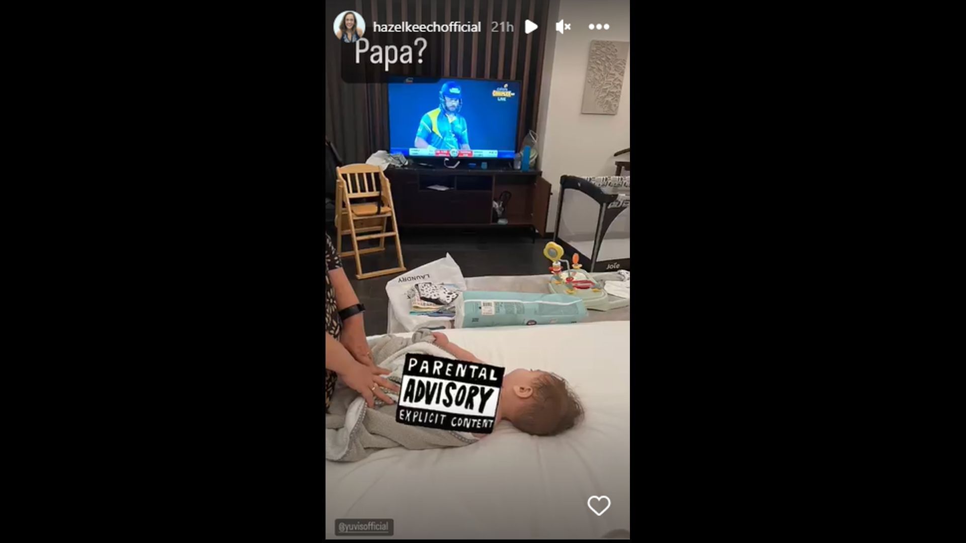 चौथी तस्वीर में ओरियन टीवी देख रहे हैं, जिसमें युवराज सिंह नज़र आ रहे हैं। इसमें टीवी स्क्रीन पर युवराज को रोड सेफ्टी वर्ल्ड सीरीज के एक मैच में खेलते हुआ देखा जा सकता है। इसमें उन्होंने लिखा ‘पापा?’