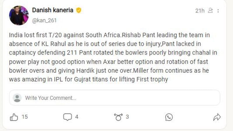 पूर्व पाकिस्तानी स्पिनर दानिश कनेरिया ने सोशल मीडिया एप 'कू' (Koo) पर एक पोस्ट लिखा। उन्होंने कहा कि भारत ने दक्षिण अफ्रीका के खिलाफ पहला टी20 गंवाया। केएल राहुल की गैरमौजूदगी में ऋषभ पन्त टीम की अगुवाई कर रहे हैं क्योंकि वह चोट के कारण सीरीज से बाहर हो गए हैं। 211 रनों का बचाव करते हुए पन्त की कप्तानी में कमी दिखी। पन्त ने गेंदबाजों को खराब तरीके से रोटेट किया। चहल को पावरप्ले में लाना अच्छा विकल्प नहीं था जबकि अक्षर एक बेहतर विकल्प थे। तेज गेंदबाज के ओवरों का रोटेशन के अलावा हार्दिक पांड्या को भी सिर्फ एक ही ओवर दिया गया। मिलर ने गुजरात टाइटंस के लिए पहली आईपीएल ट्रॉफी उठाने के समय की फॉर्म को बरकरार रखा।