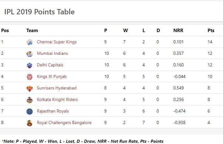 वहीं दिल्ली कैपिटल्स ने किंग्स इलेवन पंजाब के खिलाफ मुकाबला जीतकर दो अंक बटोरे। उनके 10 मैचों में 6 जीत के साथ 12 अंक हो गए हैं। दिल्ली अंक तालिका में तीसरे स्थान पर है। चेन्नई इस सूची में शीर्ष पर बनी हुई है।