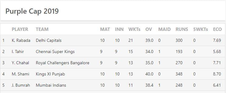 कगिसो रबाडा 10 मैचों में 21 विकेट के साथ पर्पल कैप धारक हैं। वहीं मुंबई के खिलाफ दो विकेट लेने वाले श्रेयस गोपाल 9 मैचों में 10 विकेट के साथ 10 वें नम्बर पर हैं। इनके अलावा ताहिर, चहल और मोहम्मद शमी इस सूची में क्रमशः दूसरे, तीसरे और चौथे स्थान पर हैं।