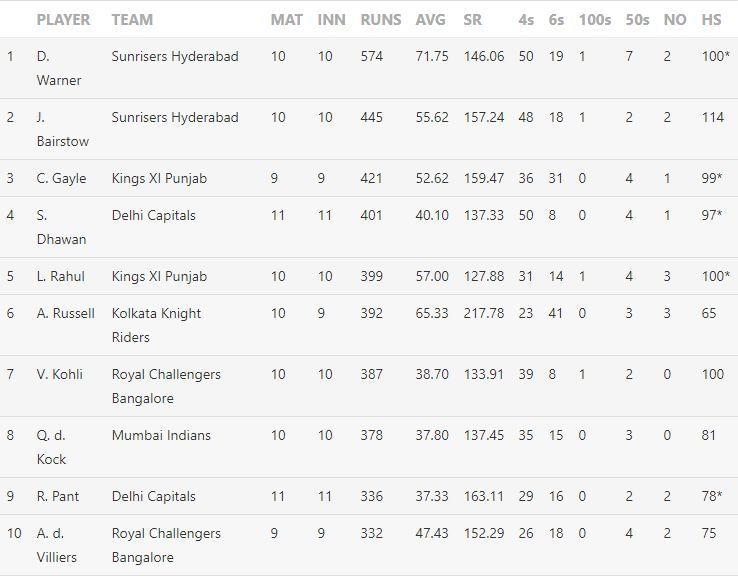 सनराइजर्स हैदराबाद के सलामी बल्लेबाज डेविड वॉर्नर ने 57 रन बनाए। वह अब 574 रनों के साथ मजबूती से शीर्ष पर हैं। उनके जोड़ीदार बेयरस्टो अपना खाता नहीं खोल पाये थे। वह इस सूची में 421 रनों के साथ दूसरे स्थान पर हैं। इनके अलावा क्रिस गेल, शिखर धवन और केएल राहुल क्रमशः तीसरे चौथे और पांचवे स्थान पर हैं।