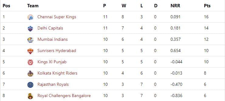 एम एस धोनी की कप्तानी वाली चेन्नई सुपरकिंग्स अब फिर से शीर्ष पर आ गयी है। चेन्नई ने अपने 8 मैच जीते हैं और 3 मैच हारे हैं। वहीं दिल्ली कैपिटल्स अब 14 अंको के साथ दूसरे पायदान पर खिसक गई है। कल का मैच हारने वाली सनराइजर्स हैदराबाद अब चौथे नम्बर पर बनी हुई है। वहीं दूसरी तरफ रॉयल चैलेंजर्स बैंगलोर अंक तालिका में अंतिम स्थान पर है।