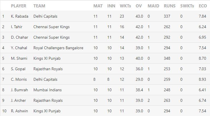 सनराइजर्स हैदराबाद के खिलाफ इमरान ताहिर विकेट लेने में नाकाम रहे। ताहिर 16 विकेट के साथ इस सूची में दूसरे पायदान पर हैं। उनके साथी खिलाड़ी दीपक चाहर ने कल एक विकेट हासिल किया। चाहर अब इस सूची में तीसरे नम्बर पर आ गए हैं। दिल्ली कैपिटल्स के गेंदबाज कागिसो रबाडा 23 विकेट लेकर इस सूची में शीर्ष पर हैं।