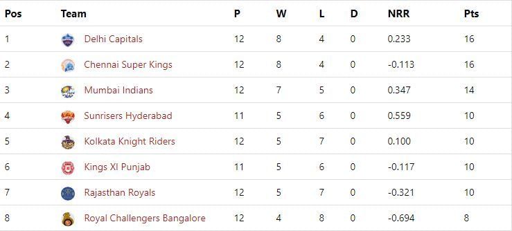 दिल्ली मैच जीतकर 16 अंको के साथ अंक तालिका में शीर्ष पर पहुंच गई जबकि बैंगलोर हार कर तालिका में अंतिम पायदान पर है। वहीं कोलकाता ने मुंबई को हराकर अपनी प्लेऑफ की संभावनाओं को जीवित रखा है। 5 जीत के साथ कोलकाता अब पांचवे पायदान पर है जबकि 7 जीत के बाद मुंबई तीसरे स्थान पर बरकरार है।