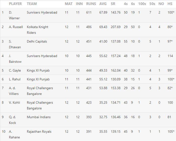 आंद्रे रसेल ने मुंबई के खिलाफ 80 रनों की पारी खेली। उनके नाम अब 12 मैचों में 486 रन हो गए हैं। रसेल इस सूची में दूसरे पायदान पर हैं। डेविड वॉर्नर 611 रनों के साथ शीर्ष पर बरकरार हैं।
