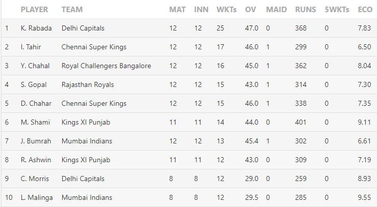 कगिसो रबाडा ने बैंगलोर के खिलाफ 2 विकेट लिए। उनके नाम अब 12 मैचों में 25 विकेट हो गए हैं। इसके साथ ही रबाडा ने शीर्ष पर अपनी स्थिति को और मजबूत किया है। युजवेंद्र चहल ने दिल्ली के खिलाफ दो विकेट लिए। चहल 16 विकेटों के साथ तीसरे पायदान पर हैं। इनके अलावा जसप्रीत बुमराह और लसिथ मलिंगा कोई विकेट नहीं ले पाये और इस सूची में क्रमशः सातवें और दसवें पायदान पर हैं।