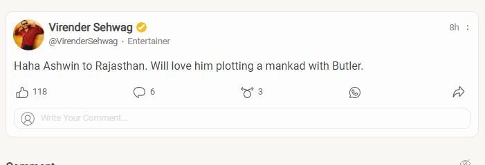 इंग्लैंड के विकेटकीपर बल्लेबाज जोस बटलर भी राजस्थान रॉयल्स की टीम में हैं। उनके साथ अब अश्विन भी होंगे। सहवाग ने दोनों के एक टीम में होने पर चुटकी लेते हुए 2019 के आईपीएल का मांकडिंग याद दिलाया। उस समय अश्विन ने पंजाब के लिए खेलते हुए बटलर को आउट किया था।