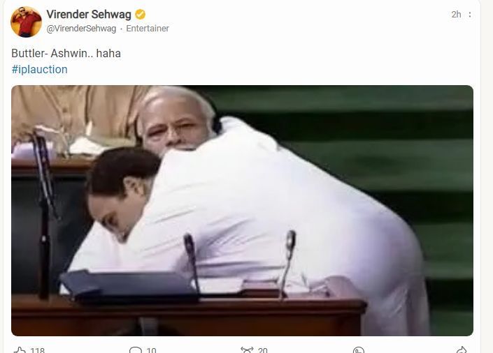 सहवाग ने सोशल मीडिया एप 'कू' (Koo) पर लोकसभा की एक फोटो शेयर की जिसमें राहुल गांधी ने पीएम नरेंद्र मोदी को गले लगाया था। सहवाग ने मजाक बनाते हुए यह भी कहा कि अश्विन अब राजस्थान में है और अब उनको बटलर के साथ मिलकर मांकडिंग की रणनीति बनाते हुए देखना अच्छा लगेगा।