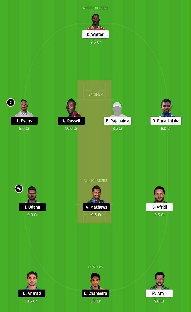 Fantasy Suggestion #1: चैडविक वॉलटन, लौरी इवांस, गुनातिलका, आंद्रे रसेल, भनुका राजपक्षा, शाहिद अफरीदी, इसुरु उदाना, एंजेलो मैथ्यूज, कैस अहमद, दुष्मंत चमीरा और मोहम्मद आमिर।
