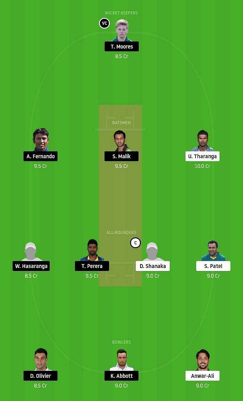 Fantasy Suggestion #1: टॉम मूर्स, अविष्का फर्नान्डो, शोएब मलिक, उपुल थरंगा, डसुन शनाका, समित पटेल, वनिंदु हसारंगा, थिसारा परेरा, डुएन ओलिवियर, अनवर अली और काइल एबॉट