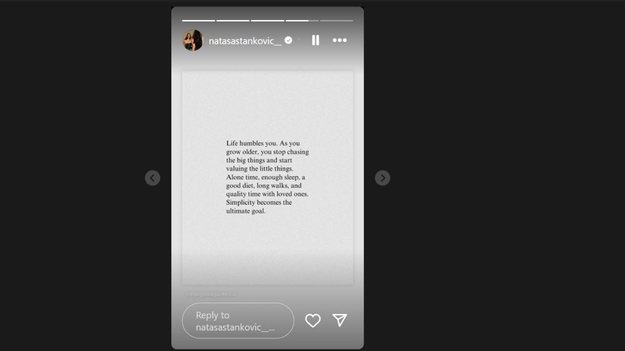 नताशा ने अपनी इंस्टाग्राम प्रोफाइल पर स्टोरी शेयर की है जिस पर उन्होंने thegoodquote.co इंस्टाग्राम पेज की एक पोस्ट शेयर की है। जिस पर अंग्रेजी में लिखा है और इसका हिंदी में मतलब है कि "जीवन आपको विनम्र बनाता है जैसे-जैसे आप बड़े होते हैं आप बड़ी चीजों का पीछा करना बंद कर देते हैं और छोटी चीजों को महत्व देना शुरू कर देते हैं। अकेले समय, पर्याप्त नींद, अच्छा आहार, लंबी सैर और प्रियजनों के साथ गुणवत्तापूर्ण समय। सरलता ही अंतिम लक्ष्य बन जाती है"