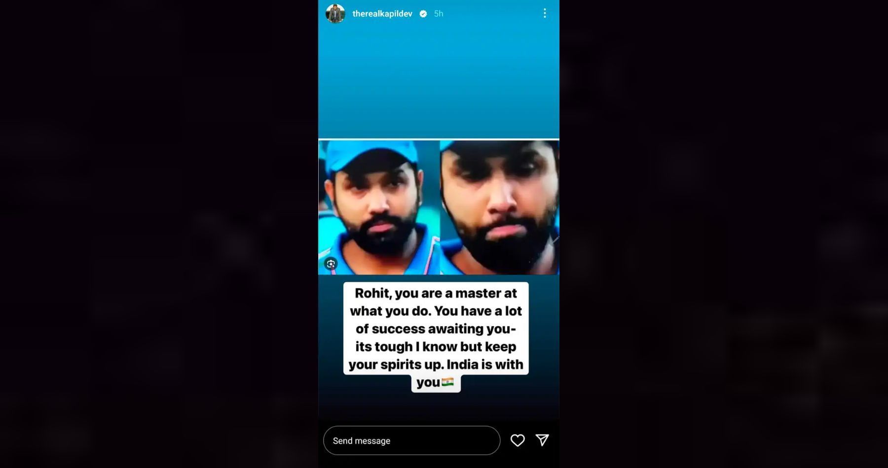 सोमवार को भारत के पूर्व वर्ल्ड चैंपियन कप्तान कपिल ने इंस्टाग्राम पर एक स्टोरी शेयर की। इसमें रोहित की दो तस्वीरें नजर आ रही हैं जो मैच के बाद की हैं। इसके कैप्शन में उन्होंने लिखा,