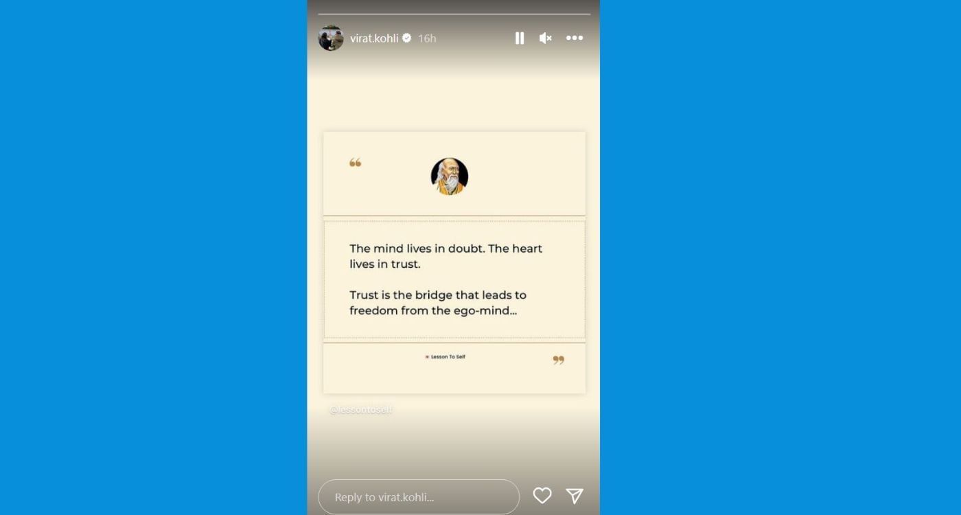 भारतीय क्रिकेट टीम (Indian Cricket Team) के प्रमुख बल्लेबाज विराट कोहली (Virat Kohli) वर्ल्ड टेस्ट चैंपियनशिप (WTC 2023) के फाइनल के बाद से ब्रेक पर हैं। टीम इंडिया अगले महीने वेस्टइंडीज (WI vs IND) का दौरा करेगी। जहाँ टीम दो टेस्ट, तीन वनडे और पांच टी20 मुकाबले खेलेगी। 12 जुलाई से इस दौरे का आगाज होगा। भारतीय खिलाड़ी इन दिनों ब्रेक पर हैं। वहीं, विराट कोहली जिम में जमकर पसीना बहा रहे हैं। वर्ल्ड टेस्ट चैंपियनशिप के फाइनल के बाद से कोहली सोशल मीडिया पर रहस्मयी पोस्ट शेयर कर रहे हैं जिसे लेकर वह काफी चर्चा में हैं। बीते दिन कोहली ने फिर से अध्यात्म से जुड़ा एक पोस्ट अपनी इंस्टा स्टोरी पर शेयर किया।