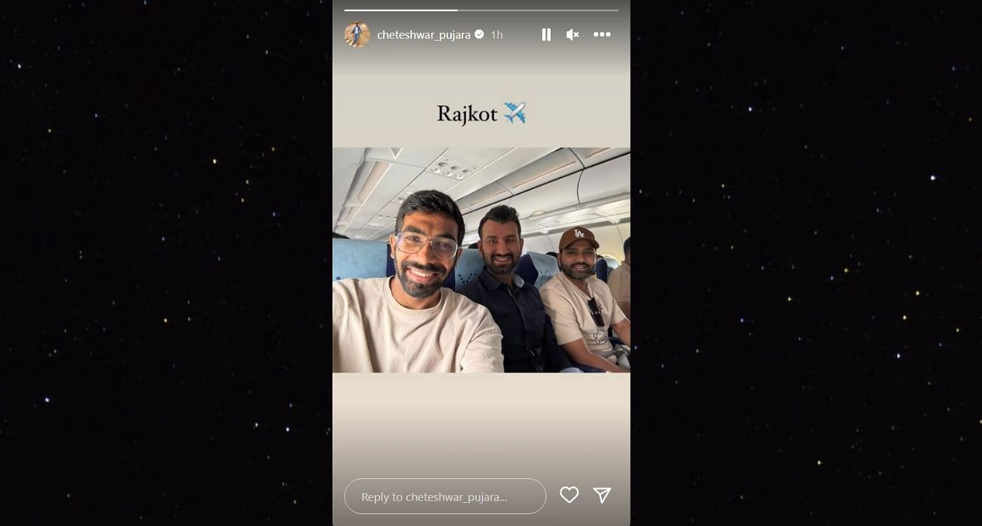 दरअसल, राजकोट चेतेश्वर पुजारा का होमटाउन है और वह काउंटी चैंपियनशिप डिवीज़न 2 में हिस्सा लेने के बाद मुंबई एयरपोर्ट से अपने घर जा रहे थे। इसी दौरान फ्लाइट में उनकी मुलाकात कप्तान रोहित और बुमराह से हो गई। पुजारा बुमराह और रोहित के बीच वाली सीट पर बैठे नजर आये और उन्होंने इस मुलाकात की एक तस्वीर अपनी इंस्टा स्टोरी पर शेयर की है।
