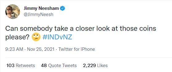 हाल ही में खेली गई टीम इंडिया और न्यूज़ीलैंड के बीच टी20 सीरीज में जिमी नीशम ने हिस्सा लिया था लेकिन वह टेस्ट सीरीज का हिस्सा नहीं है। नीशम ने ट्वीट करते हुए टॉस के सिक्के पर सवाल उठाया है। भारतीय टीम के लगातार चार टॉस जीतने पर नीशम ने ट्वीट करते हुए लिखा कि, 'क्या कोई टॉस के सिक्के को करीब से दिखा सकता है?' मतलब उन्होंने टॉस के सिक्के को पास से दिखाने को कहा क्योंकि टीम इंडिया लगातार टॉस जीतने में सफल हो रही है।