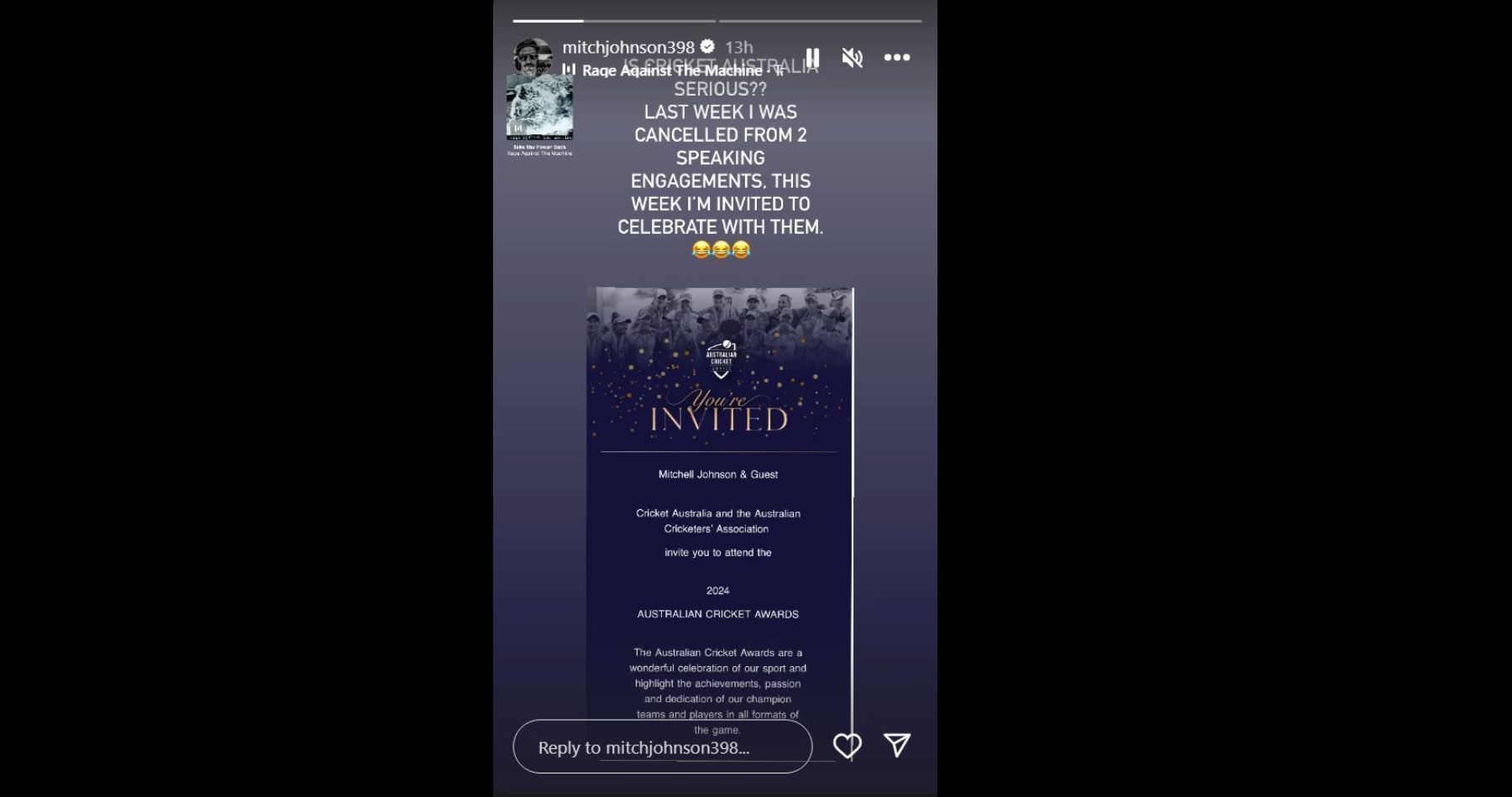 जॉनसन ने अपनी इंस्टाग्राम स्टोरी पर निमंत्रण लेटर की तस्वीर साझा करते हुए कैप्शन में लिखा, 'क्या क्रिकेट ऑस्ट्रेलिया गंभीर है? पिछले सप्ताह मुझे दो कार्यक्रम में आने से रोका। इस सप्ताह मुझे उनके साथ जश्न मनाने का निमंत्रण मिला है।' इसके साथ उन्होंने हंसने वाली तीन इमोजी भी लगाई हैं।