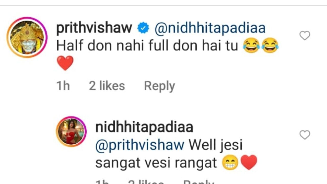 काफी दिन तक इस मिस्ट्री गर्ल की तलाश की गई तब पता चला कि यह मिस्ट्री गर्ल कोई और नहीं बल्कि एक्ट्रेस और मॉडल निधि तापड़िया थीं। साल 2016 में अपने एक्टिंग करियर की शुरुआत करने वाली निधि कई टीवी शो के अलावा कुछ म्यूजिक एल्बम में भी काम कर चुकी हैं। निधि सोशल मीडिया पर काफी एक्टिव रहती हैं। वह अक्सर अपनी खूबसूरत तस्वीरें सोशल मीडिया पर शेयर करती रहती हैं। इसी कड़ी में निधि ने सोशल मीडिया पर अपनी कुछ तस्वीरें शेयर की जिस पर पृथ्वी शॉ ने कुछ ऐसा कमेंट किया कि उन्होंने कहा कि जैसी संगत वैसी रंगत।
