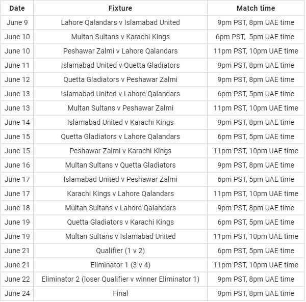 पाकिस्तान क्रिकेट बोर्ड (PCB) ने गुरुवार को 9 जून से 24 जून तक होने वाले पाकिस्तान सुपर लीग (PSL) मैचों का अंतिम कार्यक्रम जारी कर दिया है। एक बयान जारी करते हुए पीसीबी ने कहा कि पाकिस्तान सुपर लीग के शेष मैच 9 से 24 जून तक अबुधाबी में खेले जाएंगे। तमाम मुश्किलों के बीच आख़िरकार पीसीबी ने कार्यक्रम जारी कर दिया और अब टूर्नामेंट के लिए टीमें तैयारी करेंगी।