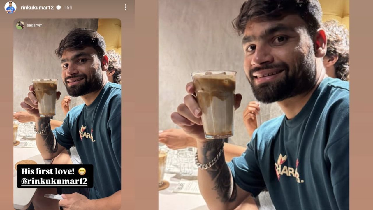 रिंकू सिंह ने मंगलवार शाम अपने इंस्टाग्राम अकाउंट पर एक स्टोरी पोस्ट की। इस स्टोरी पर आप देख सकते हैं कि रिंकू सिंह की तस्वीर के साथ लिखा है, "His First Love"। आपको बता दें कि रिंकू सिंह का पहला प्यार कोई और नहीं बल्कि चाय है। रिंकू सिंह को अन्य ड्रिंक के बजाय चाय पीना काफी पसंद है।
