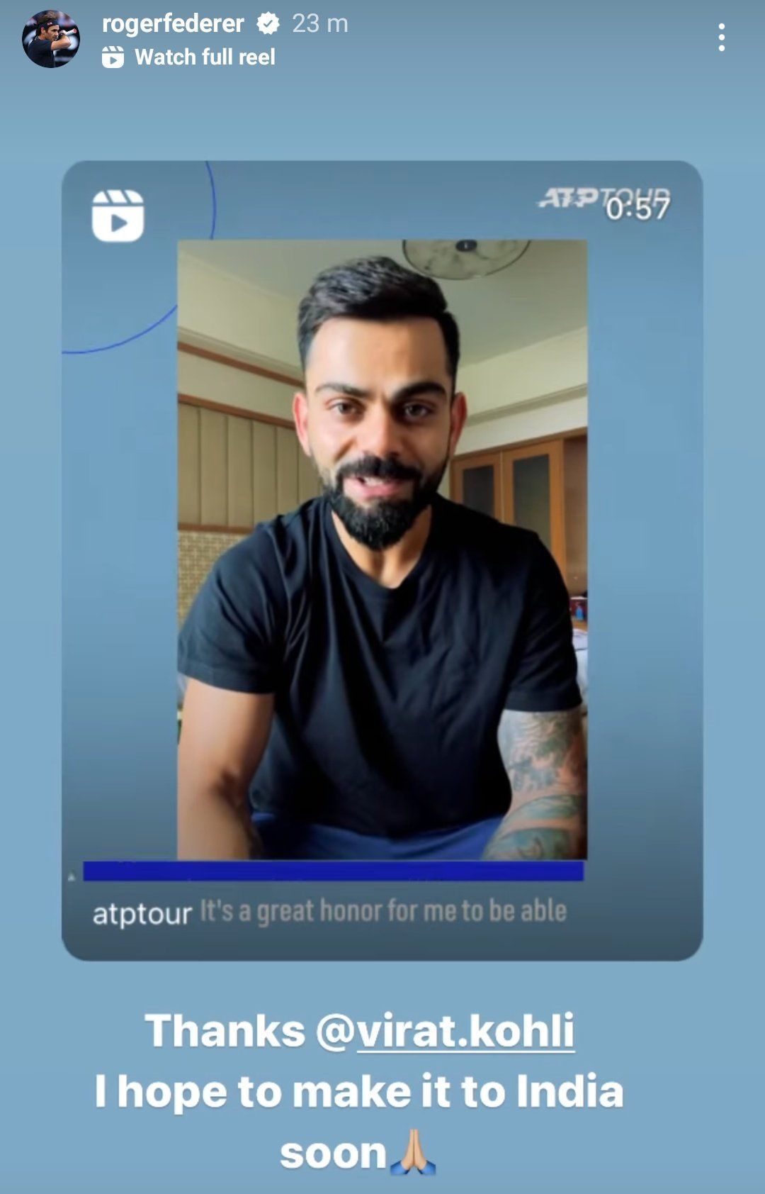 फेडरर ने अपनी इंस्टाग्राम स्टोरी पर लिखा, 'धन्यवाद कोहली मैं जल्द ही भारत आने की उम्मीद कर रहा हूं।'