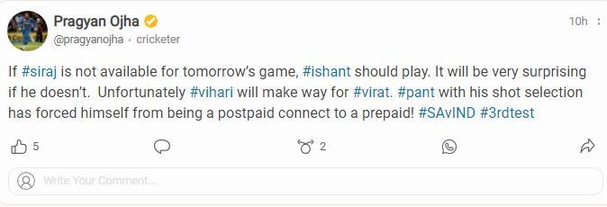 सोशल मीडिया एप कू (Koo) पर एक पोस्ट करते हुए प्रज्ञान ओझा ने लिखा कि अगर कल के मैच में सिराज नहीं खेल रहे हैं तो उनकी जगह इशांत शर्मा को खिलाना चाहिए। अगर वह नहीं खेलते हैं, तो यह हैरानी वाली बात होगी। दुर्भाग्य से विहारी की जगह विराट कोहली आएँगे। पन्त ने खुद को अपने शॉट सलेक्शन से प्रीपेड से पोस्टपेड़ कनेक्ट के लिए मजबूर कर दिया है।