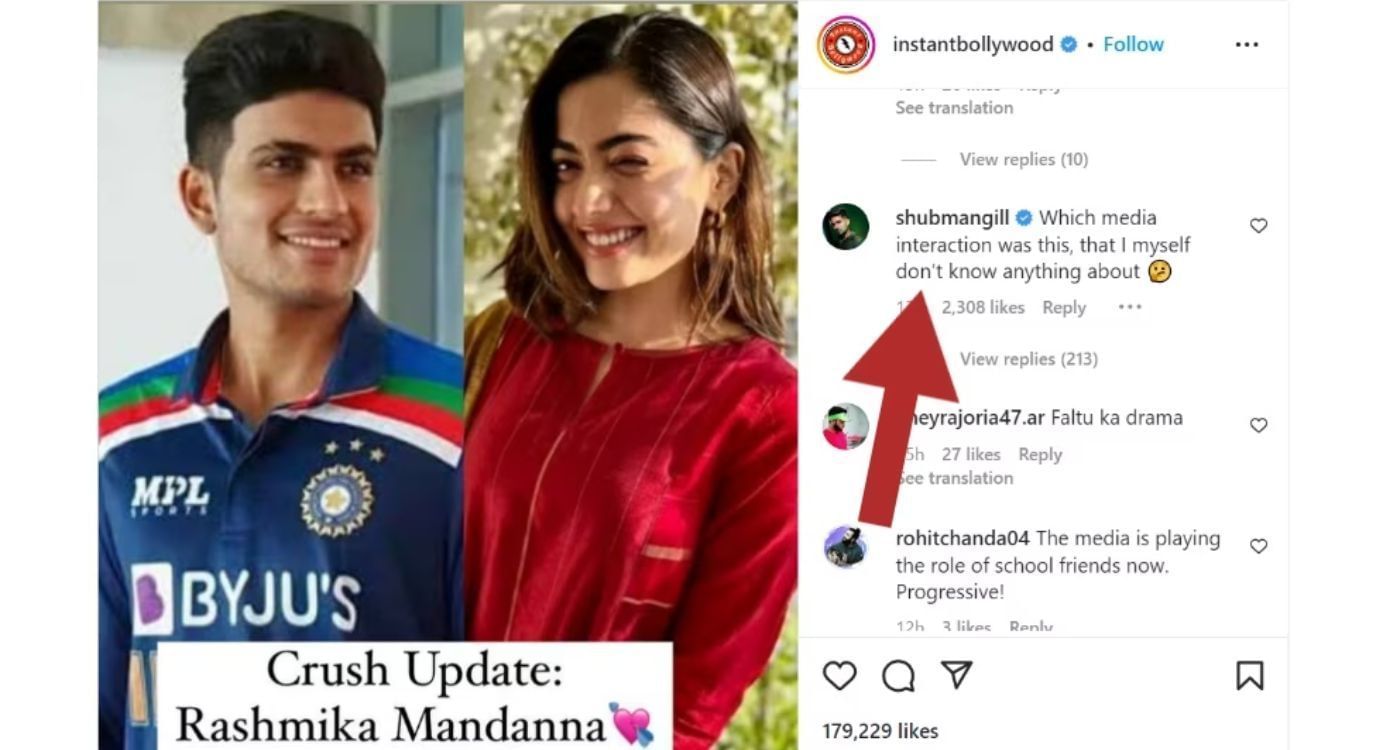 दरअसल, सोशल मीडिया पर वायरल खबरों में ऐसा दावा किया जा रहा था कि शुभमन गिल ने खुद एक इंटरव्यू में इस बात को कबूला है कि रश्मिका मंदाना पर उनको क्रश है। हालाँकि, गिल ने इन खबरों पर अपनी चुप्पी तोड़ते हुए प्रतिक्रिया दी है। शुभमन गिल ने एक वायरल इंस्टाग्राम पोस्ट पर कमेंट करते हुए लिखा, ये कौन सा मीडिया इंटरैक्शन था, जिसके बारे में मुझे खुद ही पता नहीं है।' गिल के इस कमेंट से यह साफ़ हो गया है कि इन खबरों में कोई भी सच्चाई नहीं है और ये महज अफवाह है।