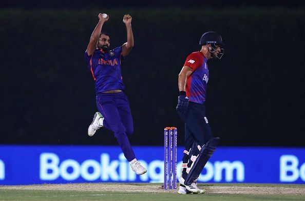 भारतीय कप्तान विराट कोहली ने टॉस जीतकर पहले गेंदबाजी का फैसला लिया। इंग्लैंड की शुरुआत तेज हुई, लेकिन चौथे ओवर में 36 के स्कोर पर शमी ने जोस बटलर (13 गेंद 18) और छठे ओवर में 47 के स्कोर पर जेसन रॉय (13 गेंद 17) को चलता किया। डेविड मलान ने 18 गेंदों में 18 रनों की पारी खेली और उन्हें 10वें ओवर में राहुल चाहर ने 77 के स्कोर पर आउट किया।