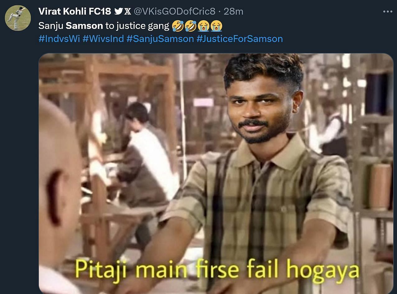 संजू सैमसन को लेकर कई बार फैंस की ये शिकायत रहती थी कि उन्हें ज्यादा मौके नहीं मिलते हैं। हालांकि वेस्टइंडीज के खिलाफ सीरीज में संजू सैमसन को पूरे मौके मिले लेकिन किसी भी मौके का वो फायदा नहीं उठा पाए। इसी वजह से अब फैंस संजू सैमसन से बेहद नाराज हो गए हैं और उन्हें ट्विटर पर जमकर ट्रोल कर दिया।