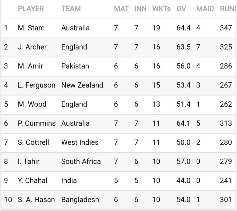 युजवेंद्र चहल ने वेस्टइंडीज के खिलाफ 2 विकेट लिए। वह 10 विकेटों के साथ इस सूची में नौवें स्थान पर हैं। स्टार्क के नाम 7 मैचों में 19 विकेट हैं और वह सूची में शीर्ष पर हैं। सूची में दूसरे पायदान पर जोफ्रा आर्चर हैं। उनके नाम 7 मैचों में 16 विकेट हैं।