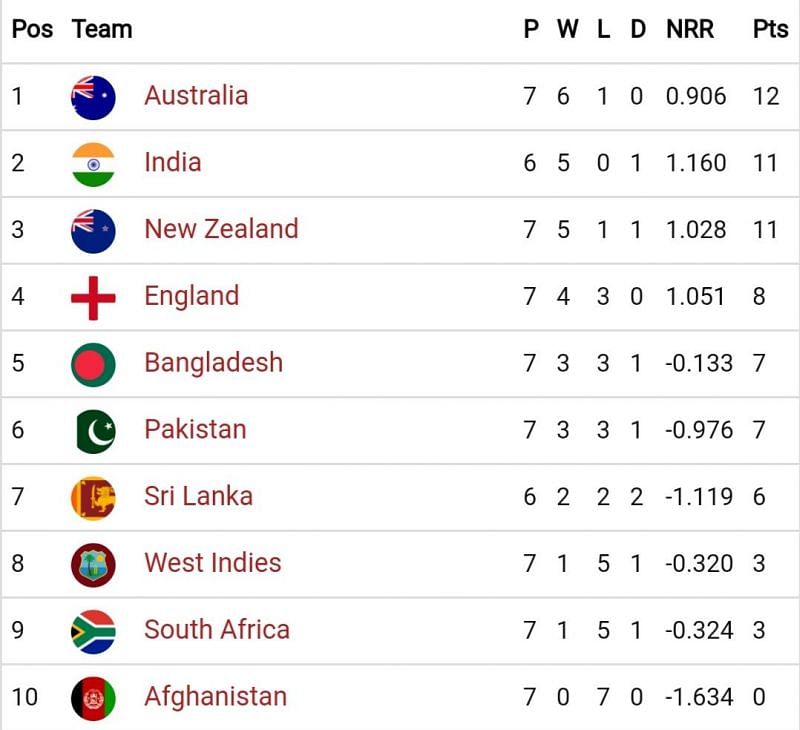 वेस्टइंडीज के खिलाफ जीत के बाद भारत के 11 अंक हो गए हैं और वह अंक तालिका में दूसरे स्थान पर आ गये हैं। दूसरी ओर वेस्टइंडीज 3 अंको के साथ आठवें स्थान पर है। ऑस्ट्रेलिया 12 अंको के साथ शीर्ष पर बरकरार है।
