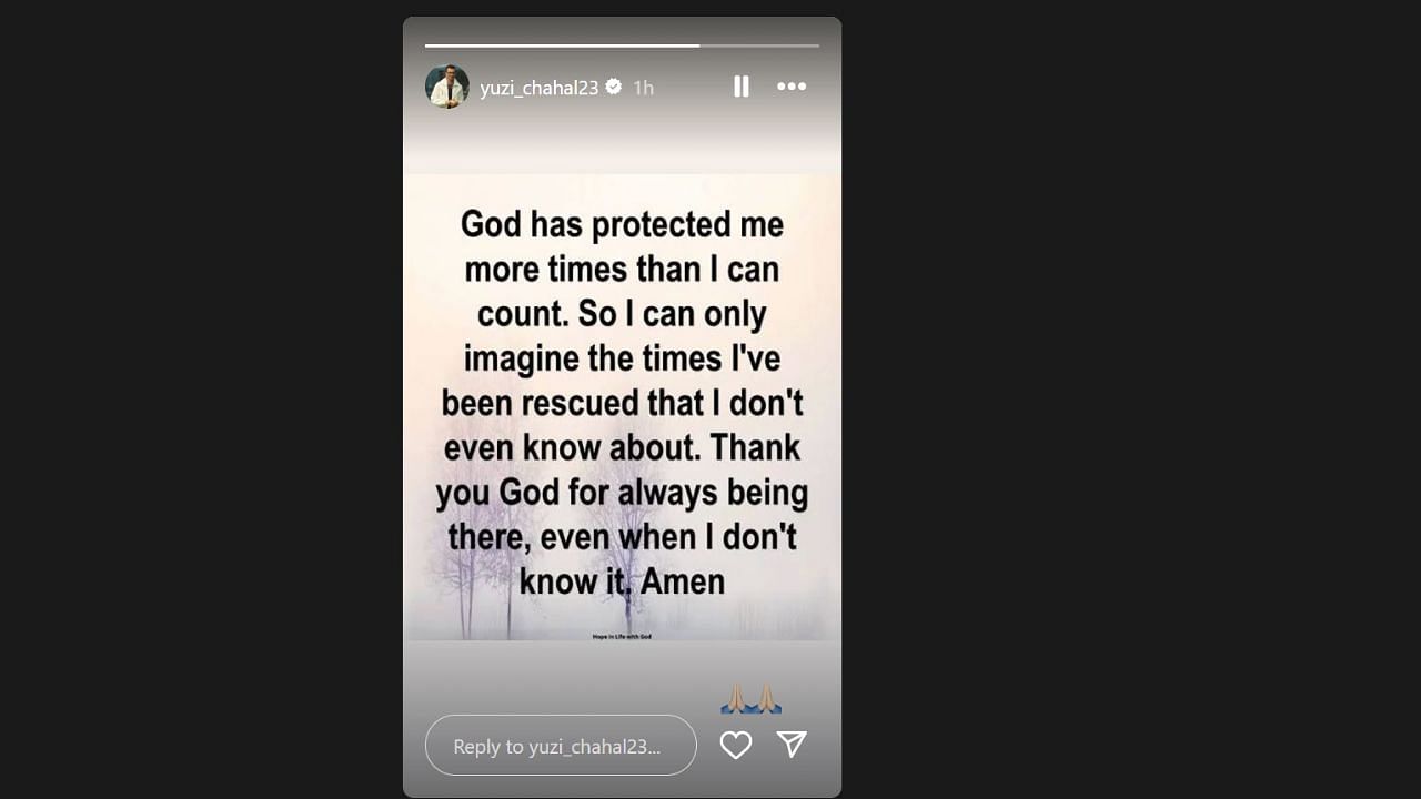 गुरुवार सुबह युजवेंद्र चहल ने अपनी इंस्टाग्राम स्टोरी पर एक पोस्ट शेयर की है, जिसमें उन्होंने अंग्रेजी भाषा में लिखा है। इसका हिंदी में आशय है "भगवान ने मुझे इतनी बार बचाया है कि मैं गिनती नहीं कर सकता। इसलिए मैं केवल कल्पना ही कर सकता हूं कि मुझे कितनी बार बचाया गया है, जिनके बारे में मुझे पता भी नहीं है। भगवान का शुक्रिया हमेशा मेरे साथ रहने के लिए, तब भी जब मुझे इसका पता नहीं होता।"