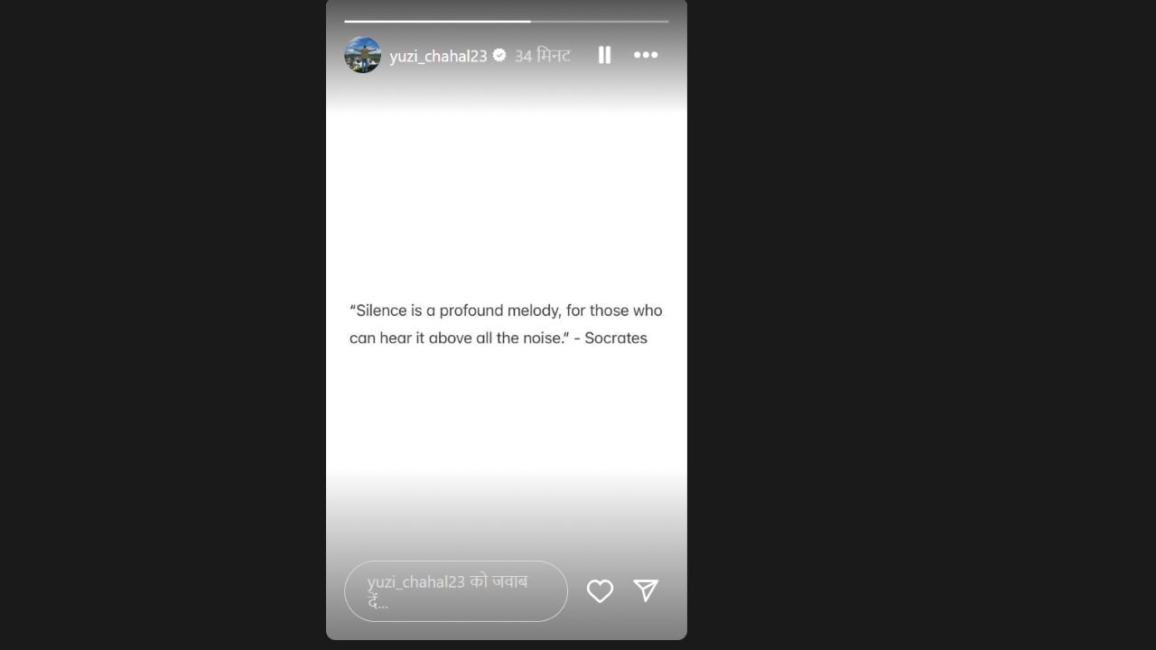 भारतीय क्रिकेटर युजवेंद्र चहल ने बीते रविवार के बाद मंगलवार की दोपहर अपनी इंस्टाग्राम स्टोरी पर एक पोस्ट शेयर की है, या यूं कहे कि उन्होंने इस स्टोरी पर अपने मन के भाव को लिखा है। युजवेंद्र चहल ने जो स्टोरी शेयर की है, उस पर अंग्रेजी में लिखा है कि Silence is a profound melody, for those who can hear it above all the noise, जिसका हिंदी में आशय है कि मौन एक गहन संगीत है जो इसे शोर से ऊपर सुन सकते हैं।