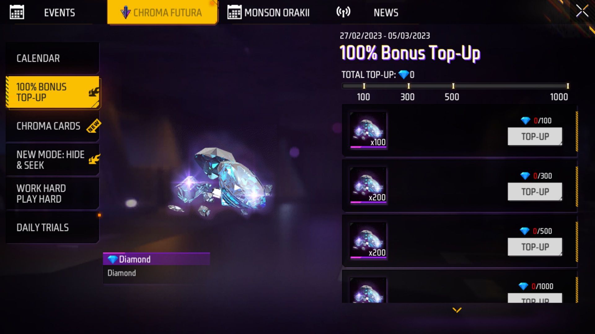 - 300 डायमंड्स परचेस करके पर मुफ्त में 200 डायमंड्स मिलेंगे
