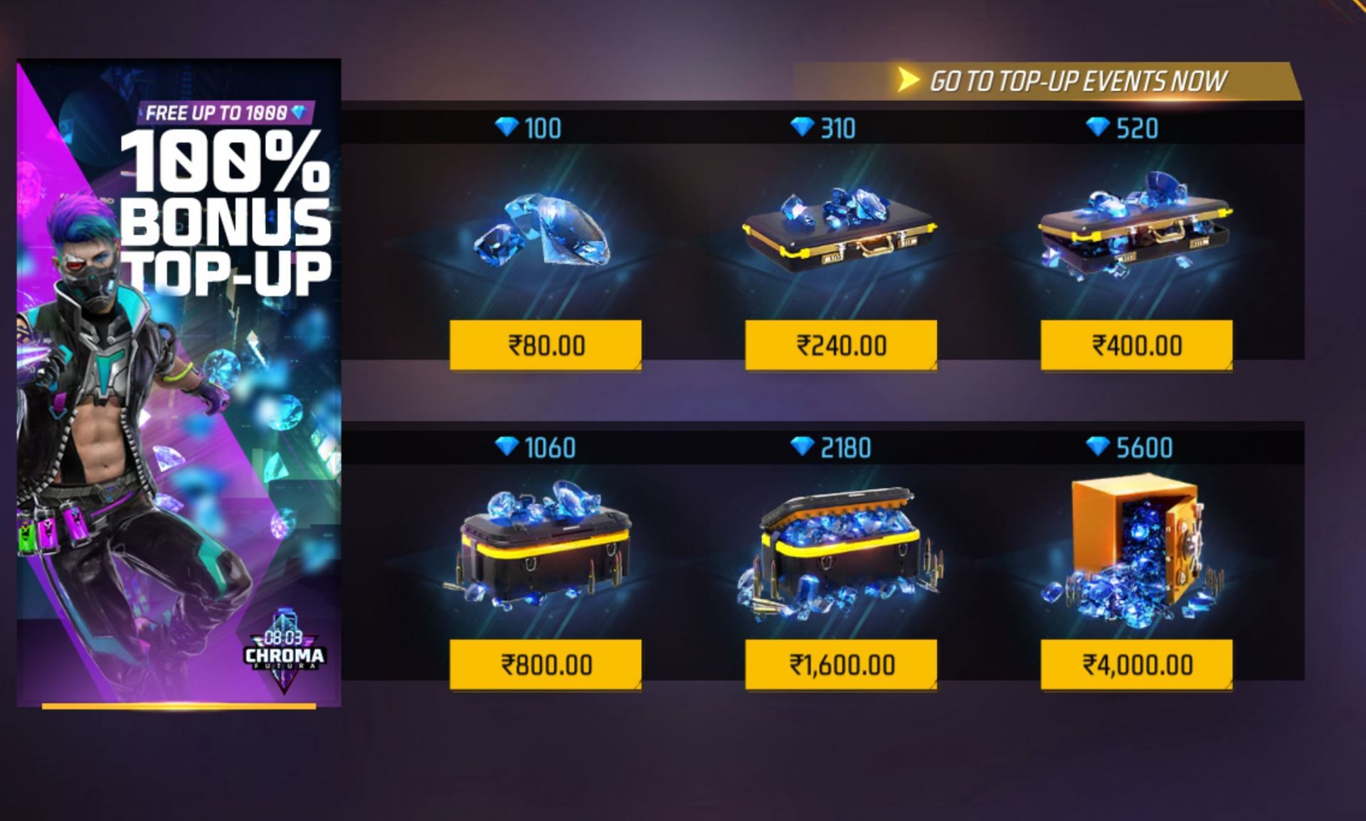 - 100 डायमंड्स परचेस करके पर मुफ्त में 100 डायमंड्स मिलेंगे