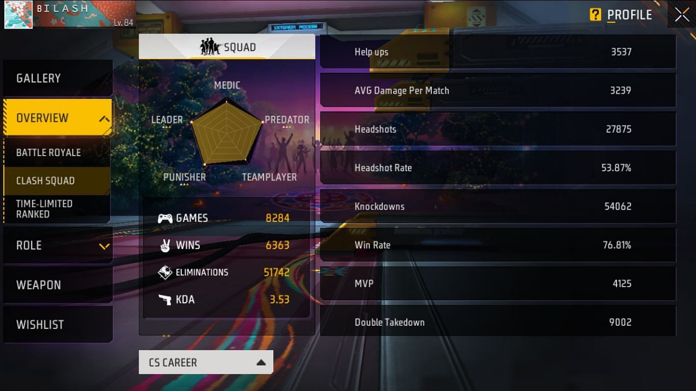 Bilash Gaming ने क्लैश स्क्वाड मोड में अब तक 8284 मैचों में हिस्सा लिया है और वो 6363 जीत प्राप्त कर चुके हैं। उन्होंने 51742 एलिमिनेशन किए हैं और उनका KDA 3.53 का है। वो 4125 मुकाबलों में MVP रहे हैं और उनका जीत प्रतिशत 76.81 का है।