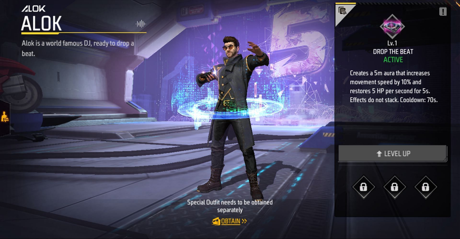 Alok के पास Drop the Beat नाम की ताकत है और इसे गेम के सबसे ताकतवर कैरेक्टर्स में गिना जाए है। आप इस कैरेक्टर से अपनी मूवमेंट स्पीड को बढ़ा सकते हैं। साथ ही आपको 5 सेकंड्स तक हर सेकंड 5 HP मिलती है। इसका कूलडाउन 70 सेकंड्स का है।