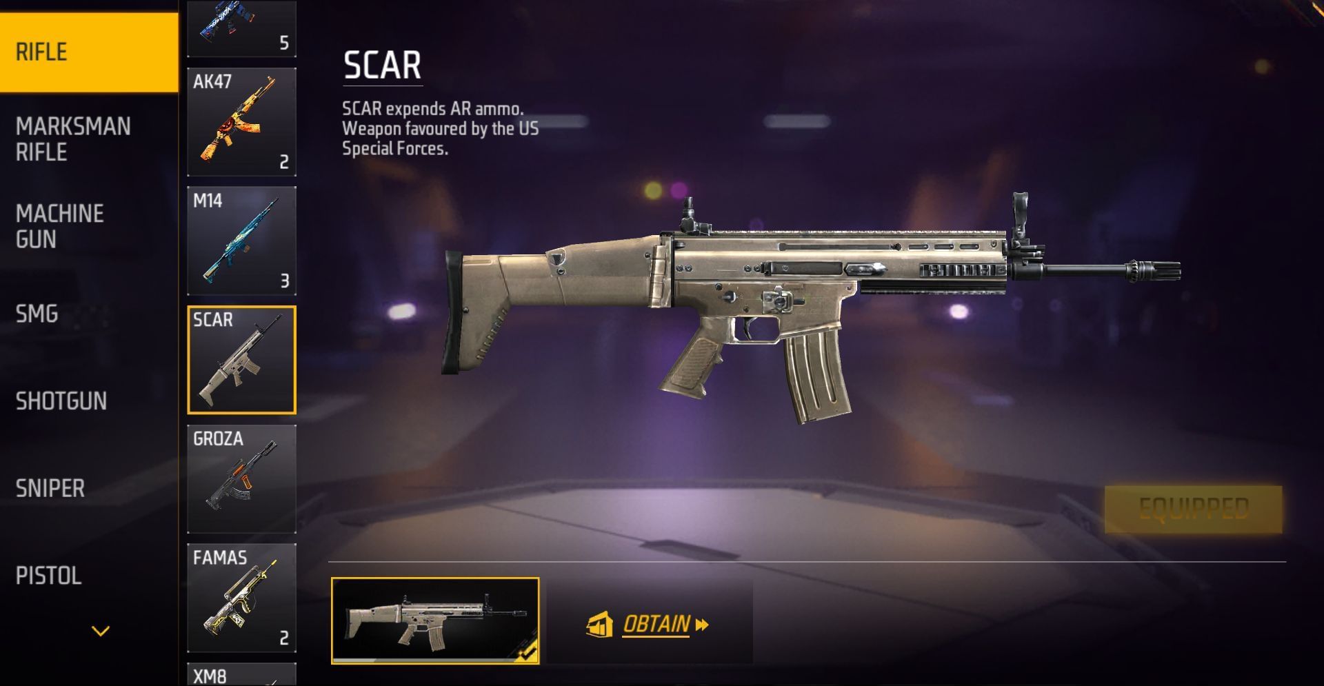 SCAR को Free Fire MAX की सबसे संतुलित असॉल्ट राइफल्स में गिना जाता है। इस गन को मिड रेंज और कभी-कभी लॉन्ग रेंज में भी इस्तेमाल कर सकते हैं। MP5 को इसके साथ रखकर आप क्लोज रेंज की फाइट्स को भी लड़ सकते हैं।