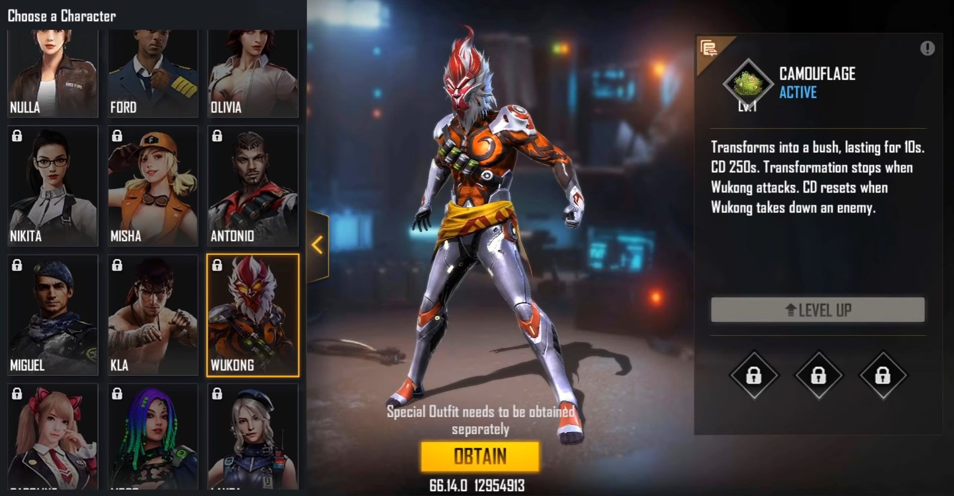 Wukong के पास Camouflage नाम की ताकत है। इसकी मदद से आप खुद को बुश में बदल सकते हैं और इसके बाद आपको पहचान पाना मुश्किल हो जाता है। इससे मूवमेंट स्पीड थोड़ी कम हो जाती है।