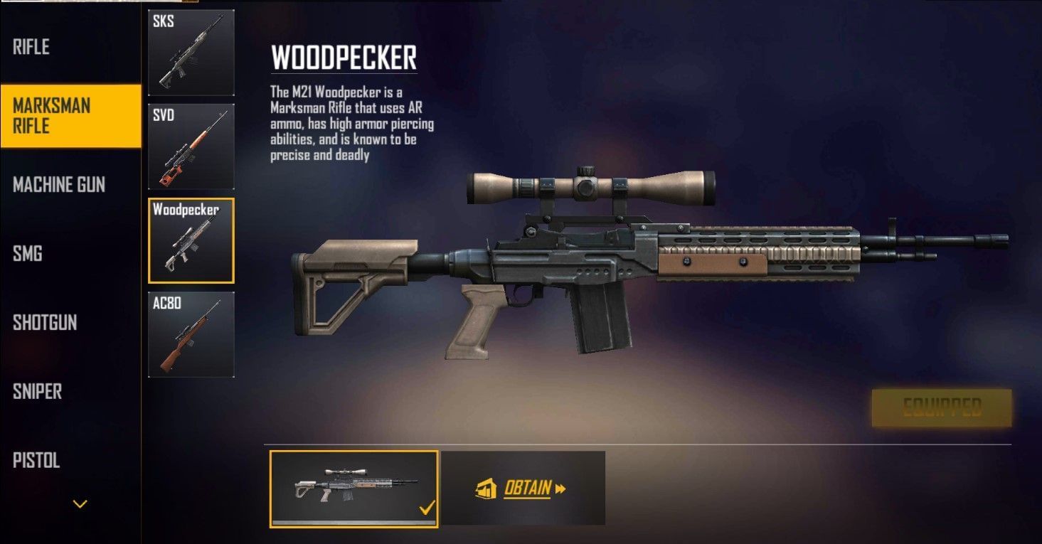 Woodpecker एक बेहतरीन गन है। इसमें पहल से स्कोप लगा रहता है और ऐसे में आप दूर मौजूद विरोधियों को आसानी से नॉक कर सकते हैं। साथ ही इसका आर्मर पेनिट्रेशन अच्छा है और एक-दो सही हिट्स में विरोधी नॉक हो जाता है।