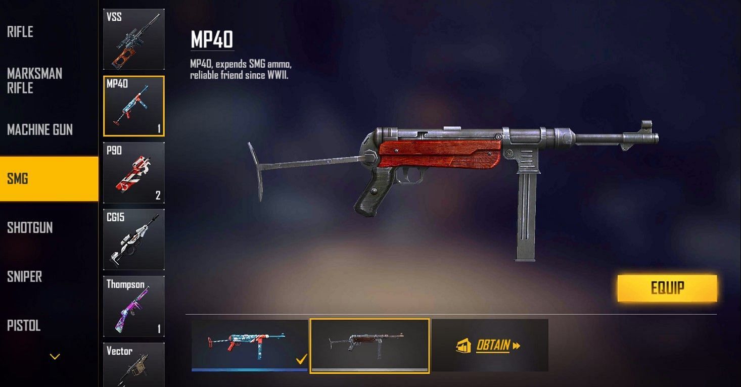 MP40 को सबसे अच्छी गन्स में गिना जा सकता है। इसका रेट ऑफ फायर तगड़ा है और मूवमेंट स्पीड 88 की है। साथ ही एक राउंड में 20 बुलेट्स आती है। यह क्लोज रेंज के लिए अच्छा विकल्प है।