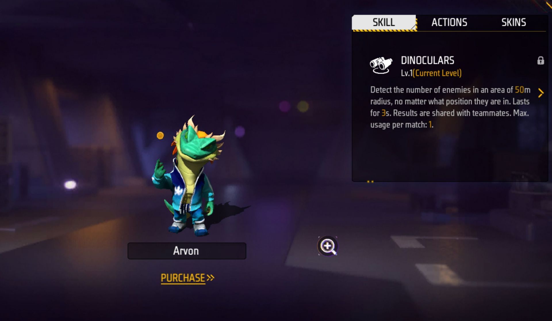 Free Fire MAX में Arvon पेट के पास Dinoculars नाम की ताकत है। इसकी मदद से आप 50 मीटर के अंदर मौजूद विरोधियों की जगह पता लगा सकते हैं। इसका इफ्केट 3 सेकेंड्स तक रहता है।